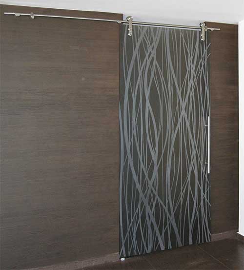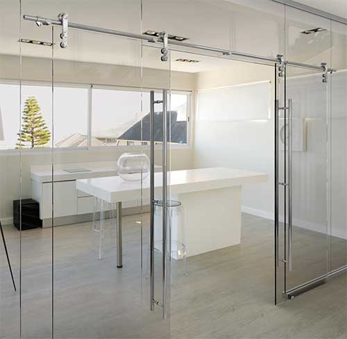 Le porte, solo a filo lucido, sono realizzate su misura in vetro temperato di sicurezza . Il binario in acciaio a sezione tonda, con diametro di 25mm e i carrelli ancorati al vetro attraverso staffe, rendono il sistema di scorrimento a vista una soluzione elegante e minimal.