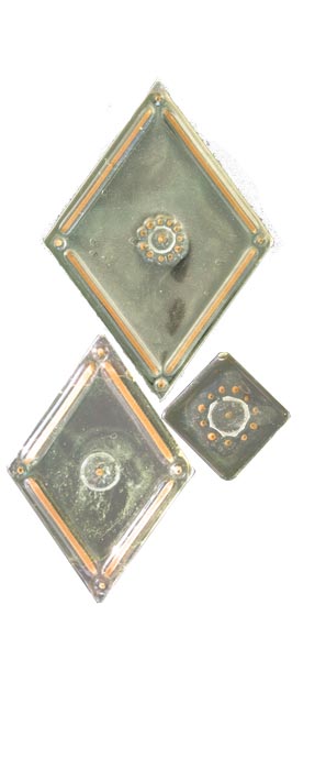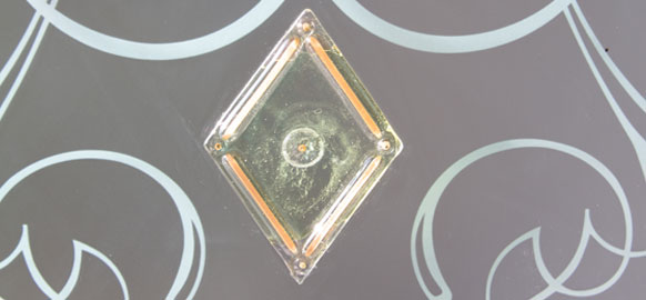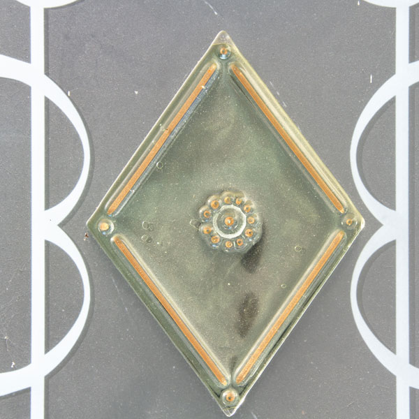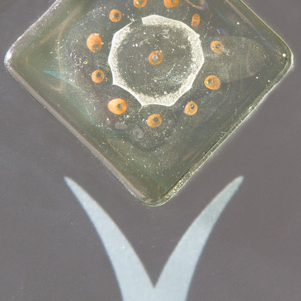 Vetro satinato con decoro sabbiato e applicazione di n. 5 murrine a rombo di Murano