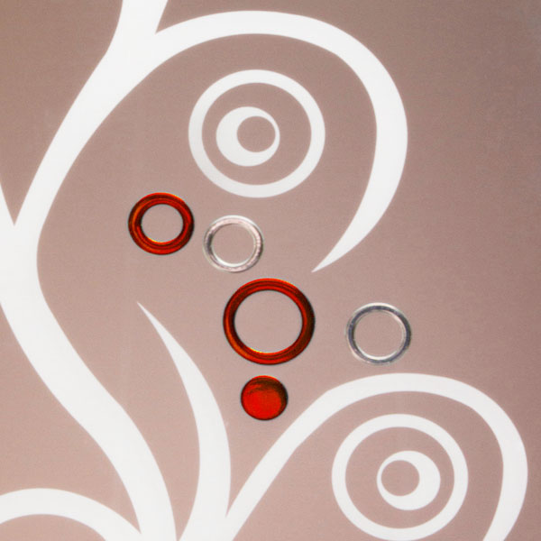 Vetro satinato, stratificato di sicurezza 44.1, con plastico PVB anticaduta frammenti tra le due lastre, con spessore di circa 8.4mm con decoro totalmente inciso e riempito con colore standard arancione. Indicato per porte interne.