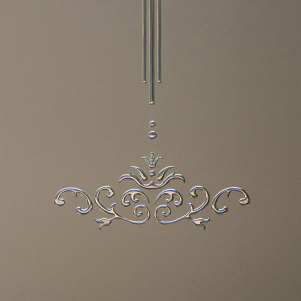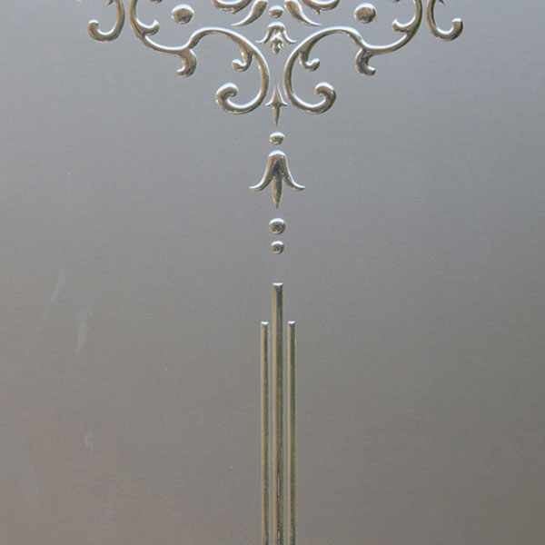 Vetro satinato con decoro sabbiato e incisione colorata in trasparenza.