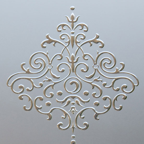 Grazie alla base satinata del vetro e ad un morbido decoro trasparente classico, il vetro sabbiato con decoro Aris viene impreziosito da incisioni e riempito con colore trasparente.