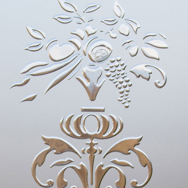 Sul lato opaco del vetro, vengono relizzati degli incavi con una profondità circa di 2/3 mm. In secondo momento vengono riempiti manualmente con degli appositi colori per vetro e messi in formo per l'essiccatura e l'indurimento.