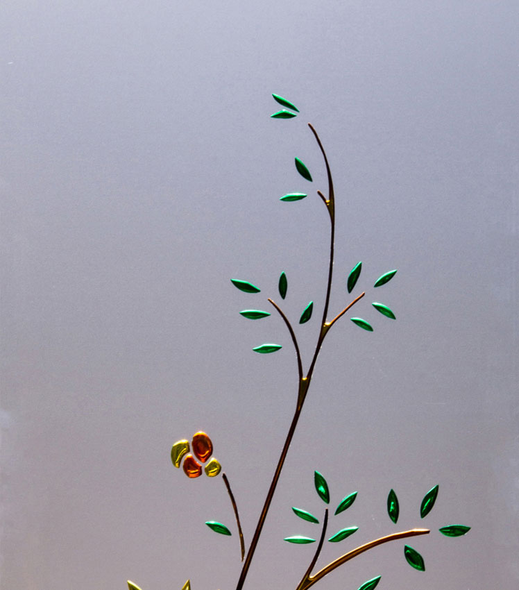 Vetro satinato, stratificato di sicurezza 44.1, con plastico PVB anticaduta frammenti tra le due lastre, con spessore di circa 8.4mm con decoro totalmente inciso e riempito con colori vari. Indicato per porte interne.
