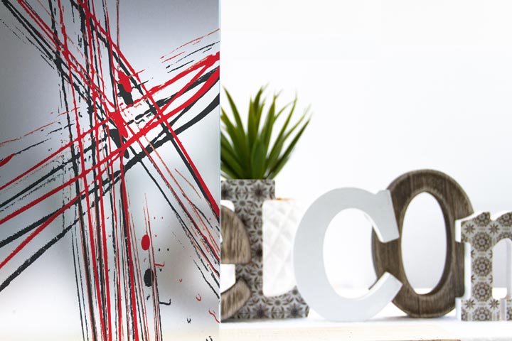 Con un decoro stampato direttamente sul vetro con tema astratto, il vetro con stampa digitale Azalee dona colore e privacy ai vostri ambienti.