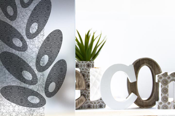 Con un decoro stampato direttamente sul vetro con tema moderno, il vetro con stampa digitale Febe dona colore e privacy ai vostri ambienti.
