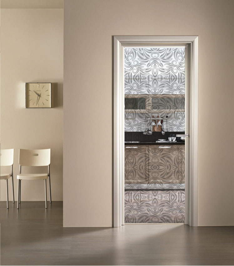 Ideato per porte in legno classiche con uno spessore standard da 6mm, il vetro con decoro Helen viene realizzato sia su vetro con base satinata sia su vetro con base trasparente e con diversi spessori a seconda delle proprie esigenze.