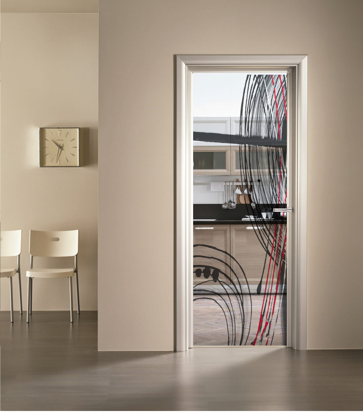 Ideato per porte in legno classiche con uno spessore standard da 6mm, il vetro con decoro Kim viene realizzato sia su vetro con base satinata sia su vetro con base trasparente e con diversi spessori a seconda delle proprie esigenze.
