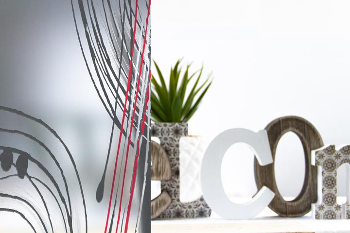 Con un decoro stampato direttamente sul vetro con tema astratto, il vetro con stampa digitale Kim dona colore e privacy ai vostri ambienti.