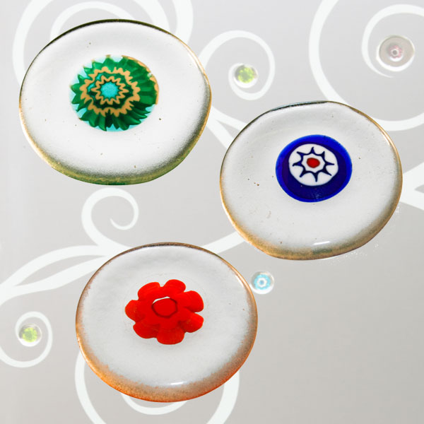 Le murrine o millefiori sono delle piccole gemme in vetro trasparente o in pasta opaca dai svariati colori e disegni . Vengono fabbricate sin dall’antichità nelle fornaci di Murano, un’ isola della laguna di Venezia. Lavorate al lume da un Maestro vetrario si ottengono dalle bacchette le gemme rotonde che fuse tra loro danno origine a svariati tipi di formelle che vengono applicate a vetri acidati o float trasparenti.