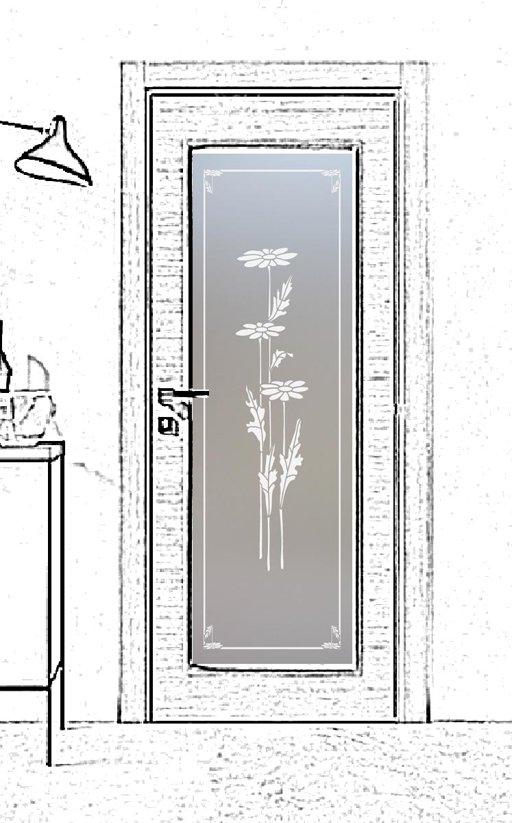 Un grande decoro floreale al centro della vetrata, circondato da un sottile ed elegante filetto verticale, regalano al vetro sabbiato Althea un tocco di classicismo.