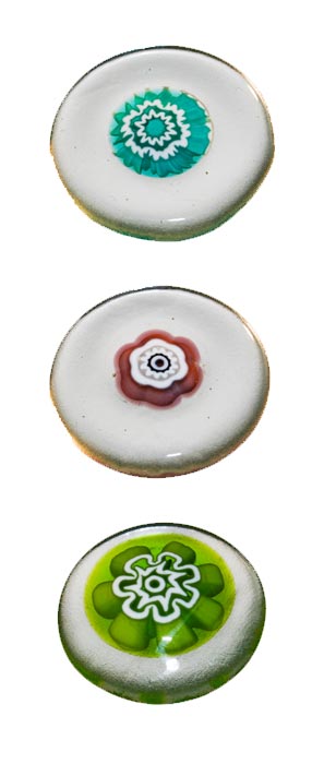 Le murrine o millefiori sono delle piccole gemme in vetro trasparente o in pasta opaca dai svariati colori e disegni . Vengono fabbricate sin dall’antichità nelle fornaci di Murano, un’ isola della laguna di Venezia. Lavorate al lume da un Maestro vetrario si ottengono dalle bacchette le gemme rotonde che fuse tra loro danno origine a svariati tipi di formelle che vengono applicate a vetri acidati o float trasparenti.