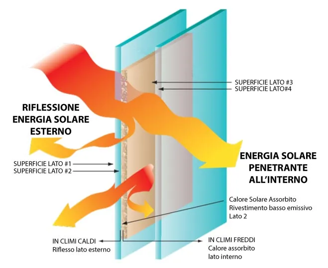 Uno di questi due vetri, in base a determinati parametri, quali esposizione della casa, tipologia di infissi ecc, possono essere vetri particolari trattati termicamente per permettere un miglior benessere interno quale un miglior controllo solare e apporto termico.